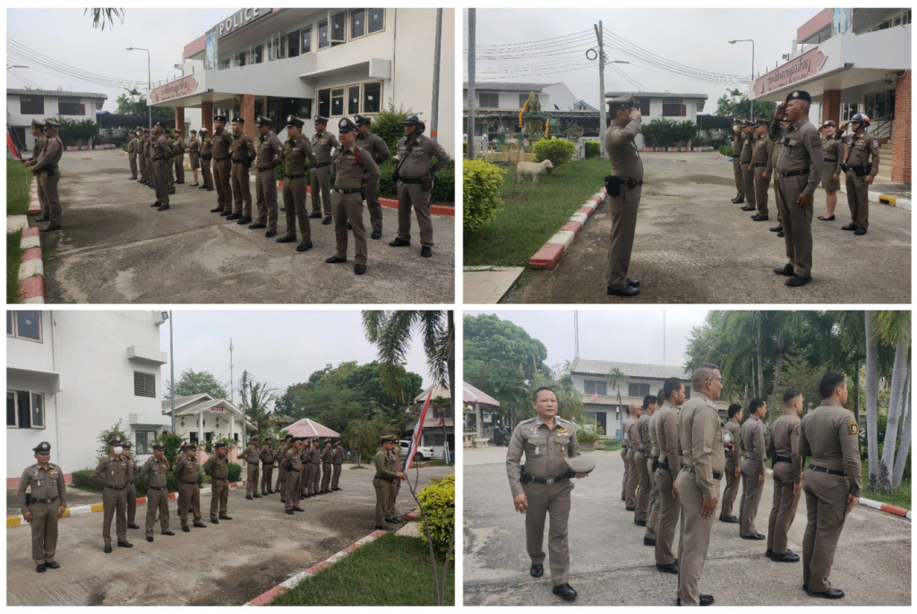 ไม่มีหมวดหมู่ สถานีตำรวจภูธรห้วยงู เข้าแถวเคารพธงชาติ สวดมนต์ กล่าวคำปฏิญาณ ตรวจเครื่องแบบและทรงผม อบรมชี้แจงข้อราชการ 15 ตุลาคม 2023 /